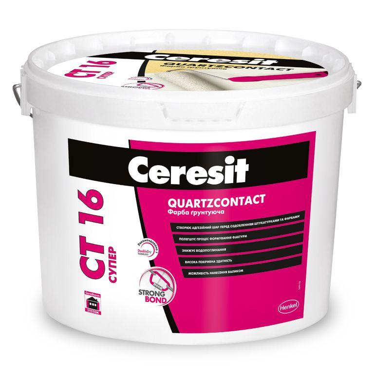CERESIT® СТ 16 — ґрунтуюча фарба для створення контактно-адгезійного шару на мінеральних та органовмісних поверхнях, їх зміцнення, зменшення і вирівнювання водопоглинання, а також для зручності процесу формування фактури декоративних штукатурок. Рекомендується для консервації фасадів на зимовий період. Найкраще підходить для влаштування систем утеплення – перед нанесенням тонкошарових декоративних штукатурок. За необхідності тонується у темні та світлі кольори.